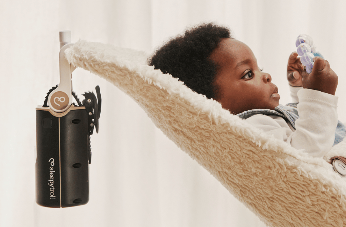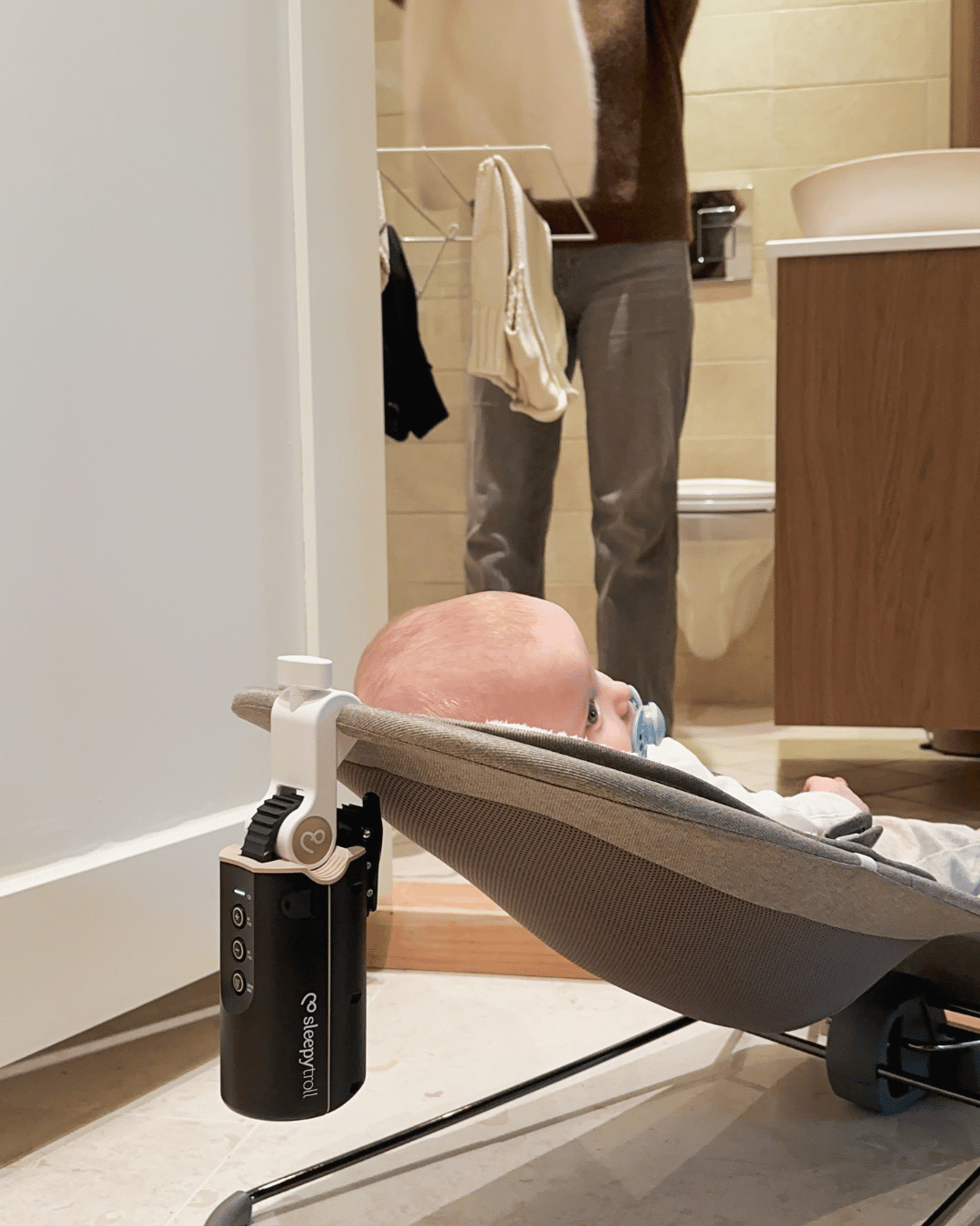 Beruhigt sich Ihr Baby durch Schaukelbewegungen? Kein Bedarf an teuren, automatischen Wippen dank des Sleepytroll Wippenadapters und dem Sleepytroll Baby Rocker.